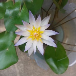 フラッペカップの熱帯睡蓮、ミニミニドウペンです。熱帯睡蓮は初めてで、こんな小さい入れ物でほんとに咲くのかなと思いましたが、開花してくれました。かすかにバニラのような香りがあります。白に近い淡いブルーの花です。