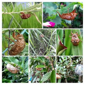 最近 散歩道で見つけた セミの脱け殻を集めました いろいろな植物で 孵化が行われていたんですね!
