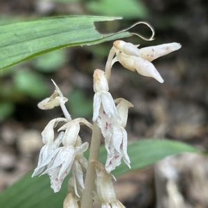 今日2枚目は今年も咲た タシロラン✨🤍✨ ラン科トラキチラン属🤍 別名-タカトリラン ①お花は下部から開花し苞は長さ7~12㎜、幅4~7㎜、紅紫色の斑点が🤍💜🤍 ②葉緑素を持たない腐生植物で全体に白黄色✨🤍✨ ③タシロランの名前は発見者の田代善太郎氏の名を取り牧野富太郎博士により命名されたそう ④定点観察のコクランも開花 コクラン (黒蘭)の名前は花や花茎が黒っぽく見えるから⚫ ラン科クモキリソウ属🌿 ⑤茨城県以南〜九州の常緑樹林内に生え偽球茎は多肉質で葉は広楕円形🌿 先が尖り長さ5〜12cm🌿花茎は高さ15〜30cmで暗紫色の花を5〜10個総状につけます🌿💜⚫💜🌿 🏷白い貴婦人✨ 🏷可憐な火曜日 🏷野生ラン 昨日の森林公園で🏞