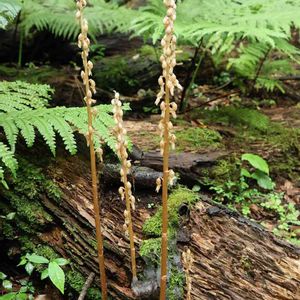 タシロラン(田代蘭) 在来種 環境省レッドデータブックでは、準絶滅危惧(NT)に指定されている。 ラン科トラキチラン属。 明治39年田代善太郎が発見したのでこの名がついた。 葉緑素を持たない腐生植物。(落ち葉などの養分をもらって根に菌類を共生させて菌類を介して養分を得る植物。)