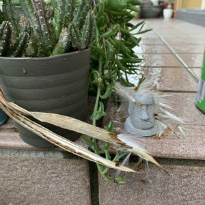 こんばんは(o´ω`o)ノ))〜 初めて🏷モアイの日 参加させて頂きます 1枚目 🏷モアイの日 3月28日に投稿したガガさま(2枚目参照) なかなか咲かないな〜と思ってたんですが💦 仕事から帰ってきたら⁉️ ????種?が····· 蕾だと思っていた物が 種の入った鞘🫛だった?!みたいです😅 3枚目 今年植えた百合ダイナミックが 1番最初に咲きました😊 トトロが真っ赤な金魚に乗って見に来たよ〜😁 4枚目 アオエニウムのハロウィン 新芽かと思ったら花?!が 咲きました😅