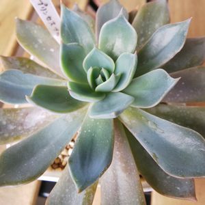 E.'プリンセスブルー' 3月29日ガーデンメッセさんよりお迎え タナベフラワー産 2.5号鉢 強いですね、この子 夏で少し緑が入りましたがお粉が増えて、最近涼しくなったので爪はピンクになって来ました 遠目に見ると虹色に見えますね 交配は分かりません 相当巨大になった株をガーデンメッセさんの寄せ植えで見ました この秋はどこまで大きくなるかな? 春に伸びきったから大きくならないかも