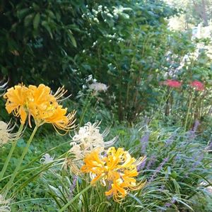 あちらの方に赤い ꧁ ヒガンバナ ꧂ 三つの色を一つの画面に収める事が出来ました〰️ (๓´˘`๓)♡┈┈┈┈••✼