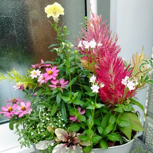 おはようございます😊☔ 今朝ひんやりと寒い朝になりました。 寄せ植え娘より🎶 セロシア キンギョソウ ジニア ネメシアのピンク 斑入りジャスミン アジュカ゚等 暫くは楽しめそうです❣️