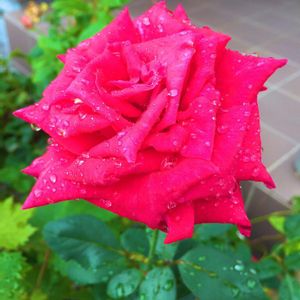育てているバラが咲きました。『クリスチャンディオール』というバラです。毎日雨降りですが、雨粒が宝石みたいです💎。
