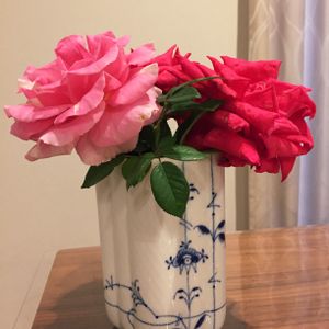 バラをロイヤルコペンハーゲンの花瓶にいけました。 可愛いですね💕。 クロードモネ と クリスチャンディオール です🌹。大輪の花は存在感がありますね。
