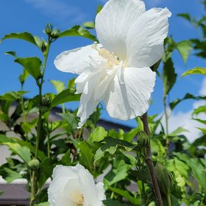 (੭*ˊᵕˋ)੭* こんばんは .。.:*☆ 。…*❁: 。 今日のお花 。:❁*… 。 🌸 ホワイトシフォン 🌸 ふんわり 柔らかい雰囲気の ムクゲさん 🤍 まだ 咲いてくれています 🫧🌺 今日も 一日 お疲れ様でした(⁎ᴗ͈ˬᴗ͈⁎)⋆*☆⡱* ・