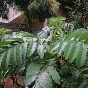 ■Melianthus major こなーゆきー、ねぇ ここーろまーでしーろく そーめらーれたなら、あっあ~あ 粉雪ではないけど初雪です⛄ 植物たち、頑張ってね。 最高気温10℃、最低気温0℃ (以下、おぎはら植物園HPより) ■メリアンサス科 半耐寒性多年草(常緑〜半常緑種) ■学名 : Melianthus major ■別名 : ハニーブッシュ、メリアンサス メジャー など ■花期 : 初夏 ■草丈 : 2m前後(生育後の高さ) ■耐寒性 : 約-6℃ ■耐暑性 : 中 ■日照 : 日向〜やや半日陰 ■原産地 : 南アフリカ(原種の主な自生地) 切れ込みのあるシルバーブルーの葉と茶褐色の奇妙な花が、オリエンタルな印象を与える。 大人の背丈以上に成長し、立ち上がる面白い見た目は他に類がなく、一株だけでも異国の雰囲気を味わえる。 〜担当スタッフのコメント〜 庭の洋書などで見かける、不思議な魅力のある植物で、憧れをお持ちの方もいらっしゃるのではないでしょうか。 当店では2000年代前半に栽培、販売しておりましたが、海外から種子の入荷が途切れてしまい休止していましたが、2020年より再販売いたします。 最大で2mにもなる大型の植物で、ギザギザと切れ込みのあるシルバーブルーの葉を羽根のように広げます。 株が大きくなると、何本もの茎が株立ちになり、特異な雰囲気をかもし出します。 初夏頃に赤褐色のユニークな花を立ち上げて、その姿は何ともエキゾチックで個性的です。 庭の目を引くポイントに植栽してオーナメント・プランツとして楽しんでみてはいかがでしょうか。独特な雰囲気が良いアクセントになり、庭に面白さを与えてくれます。