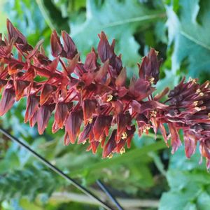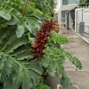 ディズニーランド ファンタジーランド ホーンテッドマンション周りの花壇 何やら 赤紫色のお花を付けた背高さん 1m50はある 名前がわかりません よろしくお願いします お花と葉っぱのアップ載せます 5月16日 撮影 ✨「メリアンサス マヨール」と教えて頂きましたぁ😊