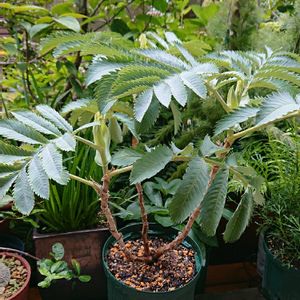 ■メリアンサス マヨール ミツバナ科メリアンサス属/南アフリカ原産 植え替えましたその1。しっかり根が張っていたので、底の方だけ少し切って植えたんですが、大丈夫かしらん。あまり情報もなく、詳しい方がいたら教えてください。葉がカッコいいんだけど、早く花もみてみたい。