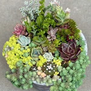 うちの多肉植物が増えすぎたので、今年の4月に友達にプレゼントした(押し付けた🤣)、多肉寄せ植えプランターを半年ぶりに見に行きました😆野晒し雨晒し、陽当たり良しの環境で、猛暑を乗り越えて順調に育っているようでした🥹❤️(下が現在) 分頭したルエラとダスティローズの成長が著しいです🔆 陽当たりの良いお家が羨ましいなとつくづく思います🤤 この友達からはもう1プランター作って欲しいと頼まれたので、これから寄せ植え作るのが楽しみです🤩次のプランターはこの写真より大きいプランターなので、いっぱい植えられちゃえます😁🪴🪷