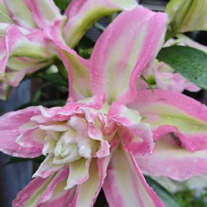 オリエンタルリリーの「メガ」という八重咲きの品種 (*^ー^)ノ♪ 名前の通り本当にメガサイズで、びっくり❗️ 8号深鉢に植えていますが、昨日は風で倒れてしまいましたヽ(; ゚д゚)ノ 。 折れなくてホッ(*´-`) 危険なので雨どいに連結😅