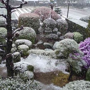 3月も終わりだと言うのに雪。 2階から見た庭Aです。