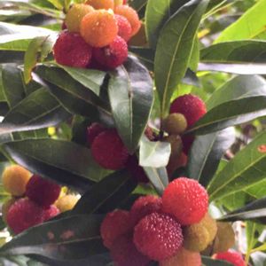 ヤマモモの実 花言葉「ただひとりを愛する」「一途」 青々とした葉っぱのつけ根に真っ赤な実をつけるヤマモモ