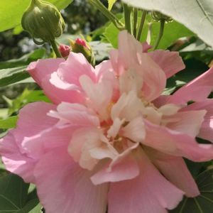 美しいピンクの透明感のある「酔芙蓉(スイフヨウ)」で、おはようございます✨🌸🥰🌸✨ 仲良く綻び始めた酔芙蓉が、絶妙な開花のタイミングを待ち望んでいるようでした💞 "酔芙蓉"は、中国原産の落葉低木🇨🇳 花名の通り、朝から夕方にかけて花の色は白から淡いピンクへほんのり色づき始め、夕方にかけて、更に濃い紅色へとドラマチックに変容してゆきます。 これは、花弁内で"アントシアニン"(色素)が合成されることによって起こる現象で、気温が高ければ高いほど変化が速く進むようです💓 酔芙蓉の美しい色彩変化に、今夏の厳しい酷暑が貢献している側面もあるんですね➰🍃🤍🩷❤🍃☀ ー花言葉は、「淑やかな恋人」、「幸せの再来」…他。