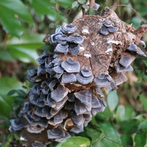 カワラタケ〜 🏡庭の梅の木にいつのまにかこんな?💦😂 📝調べたら、不食キノコで食用には向かないらしい。屋根瓦状に重なり合って群生していることから名付けられているんだそうです🤗 🌳木が弱っできてるのかな🤔