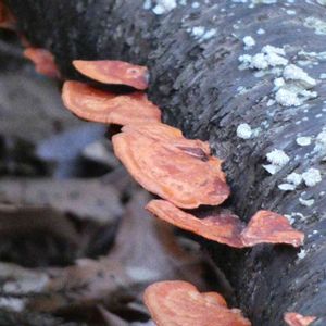 タマチョレイタケ科の仲間のキノコ🍄 どれも「木材腐朽菌」のキノコ達(枯れ木を分解するキノコ)。 広葉樹の枯れ木に生えてました🍄。 枯れ木に花を咲かせてる感じ🏵️。 形は「サルノコシカケ型🐒」と呼ばれる半円形や扇形で、硬いものが目立ちます。 鮮やかな朱色や、ビロードのような質感で、模様が美しいものを集めてみました🍄✴️。 上から カイガラタケ(色々縞模様) カワラタケ(黒白縞模様)とドングリ アラゲカワラタケ(色々縞模様)? ヒイロタケ(朱色)同居中の白色のキノコ🍄💗🍄 🐒サルノコシカケ型のキノコが硬いのは、細胞壁が分厚くて、丈夫な菌糸が混じっているからだそうです。