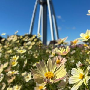 昨日の午前中 コスモスを見てきました✨ 品種別に植えてある箇所ではイエローキャンパスやディープレッドキャンパスも満開でした🌸 どこでもドアや花畑を巡るトラクターもありましたよ😄