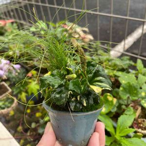 カンスゲの豆鉢二つ目 背面穴あきシリーズの鉢に入ってます 七輪陶芸なのでワイルドでまるで岩間から生えてる感を演出できてるかも?