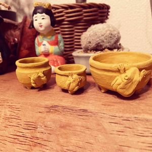 ぼんやりこだぬきと羽釜鉢🙂 ぼんやりこだぬきのガチャガチャあって即買いしてしまった😍 羽釜は豆鉢です 雨が止んだので窯に火入れしようかと思案中、、湿り気取らないといけないしなぁ🤔