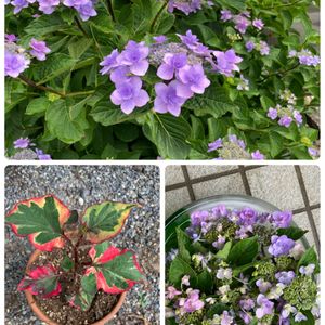 我が家の紫陽花💠 もう一本地植えの紫陽花がありましたが、狭い庭なので去年一本抜きました💦 左下はお隣さんから頂いたドクダミです🌿 地植えにしちゃ駄目だよ🙅と言われました💦 葉っぱが珍しい色ですね🪴