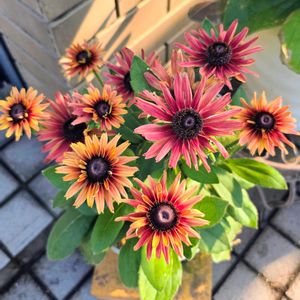 先日購入したルドベキアと唐辛子の寄せ植え🪴 最初ルドベキアと唐辛子で植えた④が寂しかったので家にあった苗を加えました☺️ ルドベキアの色が変わって赤ぽくなった、新しい花も赤いので日光の加減でかな?