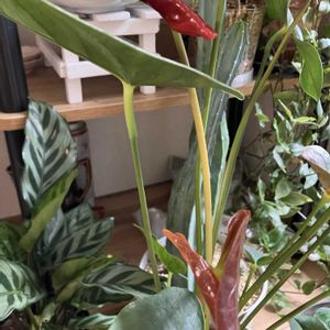 アンスリウム 新しく伸びた赤いドリルを、自然に開くの待ちきれなくて少し開いて見たら葉だった❣️ これからどんどん緑色になるのかな❓