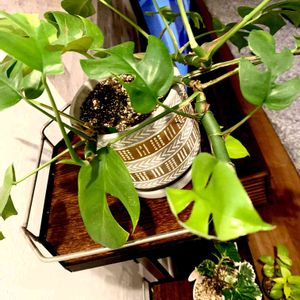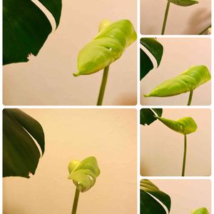 おはようございます❣️ モンステラの新葉が開きそう🥰 切れ込みが入ってそうで、嬉しい〜🌿✨ フィカスアルテシマの新葉も斑がキレイです🌱✨