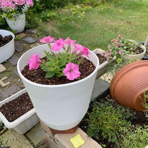 今年はペチュニア系の白をお迎えしようと決めてました✨ スーパーチュニアビスタのスノー 2株入れてます🤍🤍 他にバーベナとワイヤープランツ、ナツメグゼラニウムも一緒に寄せ植えしました😊 このあと心を鬼にしてお花をピンチ✂️ もりもり咲いてねぇ~😉 もう1枚アップしま〜す🤚