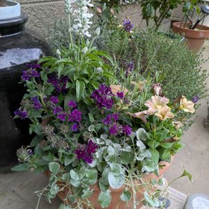 ついにウチにもやってきた高級ビオラ✨✨ 園芸やり始めた頃は普通の一株100円のパンビオでも十分満足していたはずなのに、毎年GSで素敵なパンビオコレクションを見ているうちに、目が肥えてきた気がします🤭 サトウ園芸さんのビオラ・ヌーヴェルヴァーグ「ラピスラズリ」 『趣味の園芸10月号』で見て惚れ惚れし、普段行かない園芸店まで苗を探しに出かけました🚗雑誌で見たようなシャボン色にはならなかったけど、とっても美しくて、人気がある理由がよくわかりました✨ 咲き始めは濃い紫ですが、咲き進むと色が抜けて少し雰囲気が変わります。気温が上がってきたらまた色が変わるでしょうか?今後の変化も楽しみです😊 寄せ植えの他の花も徐々に賑わってきました🌱