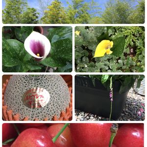 お向いの青竹と青空…。 花壇にはカラーが咲く❀.*・゚ 庭の砂利の間から咲く1本のネジリバナ💕ご近所さんから頂いた茨城のメロンと山形の🍒 アリ*:・(*-ω人)・:*ガト