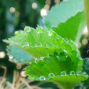 朝陽に色々なものが輝きだす 葉先に規則正しく並んだ雫もキラッキラッ