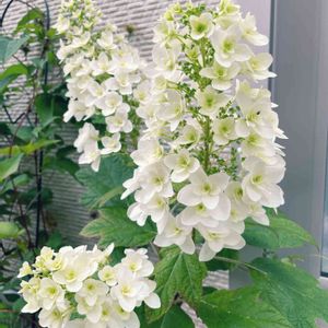 柏葉アジサイの真っ白な大きなお花咲きました 外壁のこんな狭い日陰でゴメンなさい
