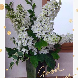 庭の柏葉紫陽花🤍 紫陽花はあっちこっち向いて 生けにくいですね。 ムクゲの枝、ツルニチニチソウ足しました。 水揚げを良くするため枝の木質部を削ぎ落として、水切りしました。