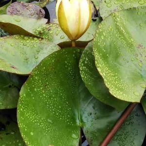 舞妃蓮の蕾。 雨上がりで 葉っぱの雨粒が綺麗です✨