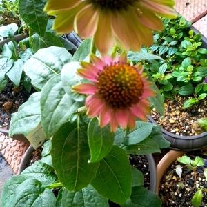 こんばんは ①エキナセア ママレードとピーチのためのソナタ ママレードからピーチへ移りゆく花色 オレンジからピンクに花色が変わる品種 単品で鉢管理 ②エキナセア プレーリーブレイズ ピンク多めの縁にライム💚 咲き進むと渋い色味に グリーン多めのお花も咲いてくれたら嬉しい🤗💓なぁ ③ジニア 小さめの花が可愛いタイプ ④、⑤近所に住む親戚の伯母さんから頂いたジニア 白と黄色をリクエストしましたが…オレンジ🏵️、ピンク❇️も開花 白花💮はどうしたのかな?と思っていたら咲いてくれました 写真のお花より上に咲いてます 小さく咲いたので…次に期待します(*´ᵕ`ㅅ)ᡣ𐭩