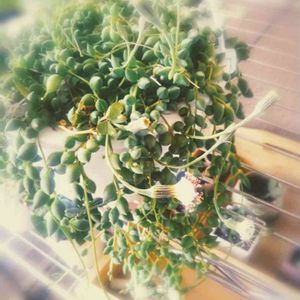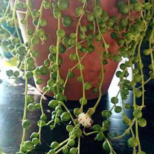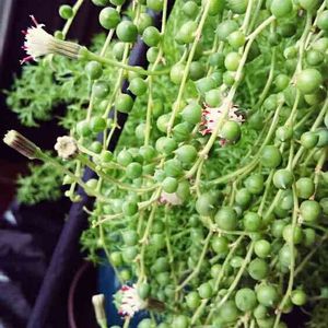 久しぶりの投稿になりました💦 ここの所、色々あって気分も落ち込み気味でしたが、やっとGSに戻ってこられました(^-^) 少しずつまたupしたいと思います。よろしくお願いします🙇 GS から離れている間、多肉ちゃんもなかなか手入れ出来ていませんでした。ネットで買った多肉ちゃんも買った状態のまま放置気味でしたが、みんな何とか元気で、このグリーンネックレスちゃんもいつの間にかお花が咲いてました😌 実はグリーンネックレスは、多肉を始めるきっかけになったというか、私が初めて買った多肉ちゃんですが、何故かいつもダメにしてしまうので、もうやめようかな…なんて思っていた中、最後の賭け?笑で買ったこのグリーンちゃん。 その約2ヶ月後…お花が咲いて、しかもお花を見たのも初めてで、今の私を励ましてくれているような気がしました(;_;)