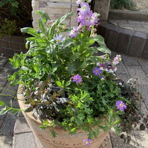 寄せ植え♡ 植え付け(5枚目)から10日🌱 🌸ストックダブルダブル 🌸ストックベイビー 🌸フェリシア 🌸ブラキカム 🌸ネメシア 🌿リシマキアミッドナイトサン 🌿キンギョソウブロンズドラゴン
