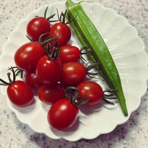 💁♀️本日の収穫💁♀️ プリンセスアイコが、一気に赤くなりはじめ、日に日に収穫が多くなりました😄 きゅうり🥒は久しぶり。 オクラベターファイブ昨日、初収穫し食べたら、スーパーで購入したオクラよりも ネバリが強く、歯ごたえもあり、美味しかったです😊