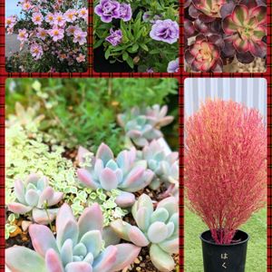 💚 はくのお庭 💚 最低気温が一桁の日が出るようになって毎日の庭パトで植物の紅葉をチェックして楽しんでいます⋆⸜(* ॑꒳ ॑* )⸝ルンルン ↖️秋明菊は強風が2~3日続いた時に斜めに傾いたのでワイヤーでまとめて棒で補強 ⬆️カリブラコアは株はもうかなり傷んできてますがお花を咲かせてくれてます ↗️アオエニウム シャネル 黒っぽいクシャクシャした姿から大変身中✨.゚・*..☆.。.:*✨.☆. ↘️ご近所さんに頂いたコキアが赤くなってきました❤️ ↙️葉挿しから大きくなったオパリナたち 今年初めてプランター草花用培養土で育成 amazarashiで逞しく育ってます (彩度を編集しておめかしして あげました(*´ ˘ `*)♡エヘヘ)