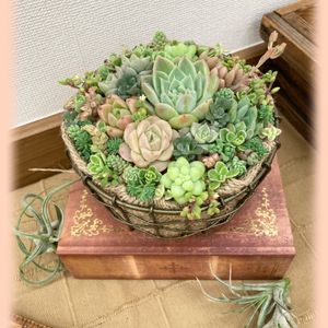 ワイヤー籠の多肉寄せ🧺 多肉教室3回目の昨日はワイヤー籠に麻布を敷いて鉢にしたものに寄せ植えしました。 これからの季節は水はけがよくていいかもですね(*´꒳`*)b セダムも花芽が付いてたりお花が咲いたりして動きのある寄せ植えが出来ました(*´꒳`*)