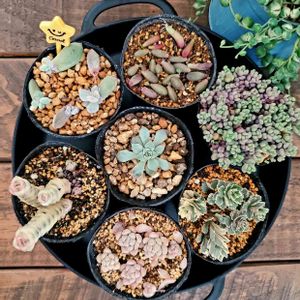 葉挿しの子や 増やしたくて挿している子を 黒ポットで育てています。 黒いお皿はアウトドアグッズの場所で売られていたのですが 黒ポットがぴったり収まって 出窓に置いたりベランダに出したり 運びやすくて便利です♪︎ 真ん中はピンクザラゴーサ。 うちでは葉挿しの成功確率が高いような~ 星のピックの子はモンロー。 花芽についていた小さな葉から出ました♡ 🏷️毎月13日と14日は葉挿しの日に参加させてください♪︎