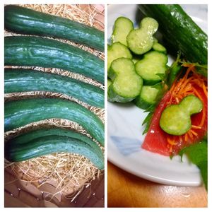 🥒ダブルキュウリ🥒 発見しました! (一番下の子) 毎日ほぼ6本採れるのですが、ダブルは初めて! 切ってみると、雪だるま?ひょうたん?の形で、刺身と一緒においしくいただきました!