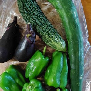 今日の収穫💠キュウリもそろそろ終わりです。ゴーヤはまだ取れると思います。ナスも、秋茄子🍆取れそうです。ししとうは、あまり取れませんでした。モロヘイヤは、カットして又生えてくるのでまだ食べられそうです。🥒🌿