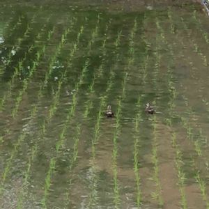 お隣さんの田んぼで 鴨(?)が仲良く朝散歩🦆