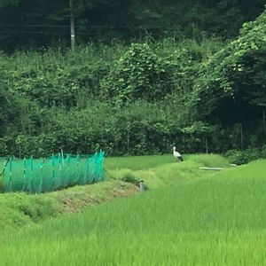 稲の緑が美しい季節 この辺りの品種は ほぼコシヒカリだとか? 特別天然記念物のコウノトリに 運良く会えました。