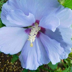 タグの写真に惹かれて購入した ムクゲ 紫盃が初開花 ハイビスカスによく似た薄紫の素敵な花です