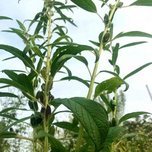 河原散歩☁️3 楽しみにしていた胡麻の実が開いてきました。上の方にはまだ花が咲いているので、開いた実だけ収穫してきました😃 黒ゴマなんですね😆