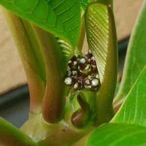 プルメリア 「カリフォルニア サンセットの花芽⑦」 今咲いている別枝から花芽、嬉しい発見👀❤ 咲くのが待ち遠しい🎵