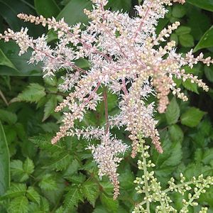 和名の由来は葉がヤマブキに似ていることからだそうです♪♪ ヤマブキショウマ(山吹升麻) バラ科 ヤマブキショウマ属 多年草 北海道、本州、四国、九州に分布。 葉は2回3出複葉。小葉は5~13㎝、幅2~8㎝で先が尖り、鋭くてよくそろった重鋸歯がある。葉の側脈は11~15対あり、あまり曲がらず葉の縁に達し明瞭。 円錐花序に多数の小花をつける。 雌雄異株。雌株の雄蕊は20個、長さは花弁の約2倍。雌株の花柱は3個。 花期6~8月 福島県 北塩原村 7月7日撮影